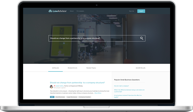 Legal knowledge is trapped in the minds of lawyers, or buried in books and legislation that only lawyers can understand. LawAdvisor is changing this by connecting everyday people with expert and easy to understand advice.